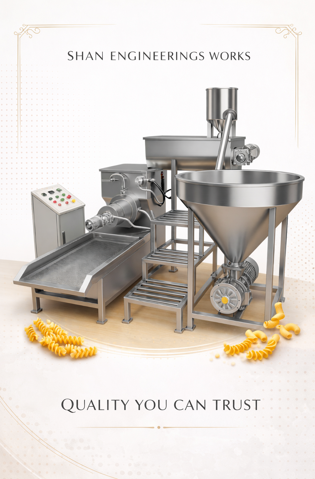 Shan Engineerings Works is a reputed Noida-based manufacturer of pasta machines in Noida, delivering food processing machinery suitable for domestic and export applications. Our pasta making machines in Noida are built to maintain uniform thickness, smooth finish, and stable production for various pasta shapes.